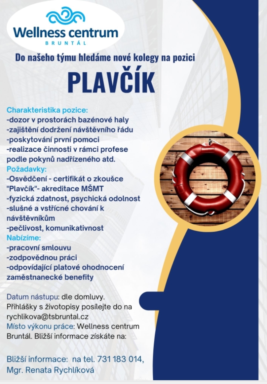 Hledáme do našeho týmu vhodné uchazeče/čky na pracovní pozici plavčík