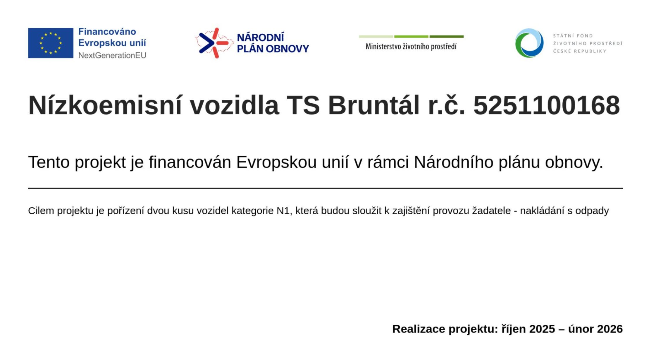TS Bruntál, s.r.o. pořídil/a nová vozidla Toyota MC24 Van a Ford E‑Transit s alternativním pohonem. Nákup byl realizován v rámci Výzvy NPŽP–NPO č. 11/2025 „Udržitelná městská doprava a mobilita“, konkrétně v rámci podpory zaměřené na pořízení vozidel s alternativním pohonem.