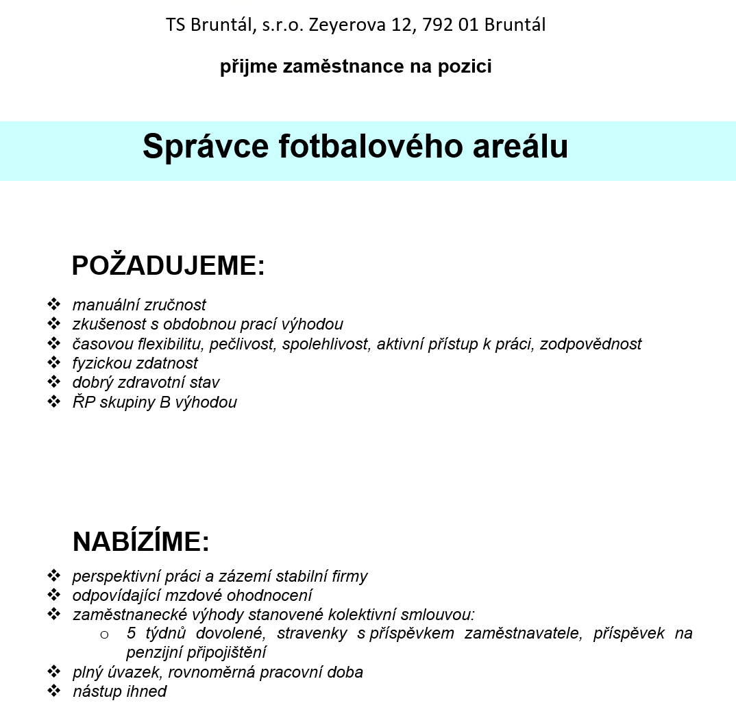 V případě vašeho zájmu zasílejte životopisy na emailovou adresu klabanova@tsbruntal.cz, nebo volejte na číslo 552 306 755