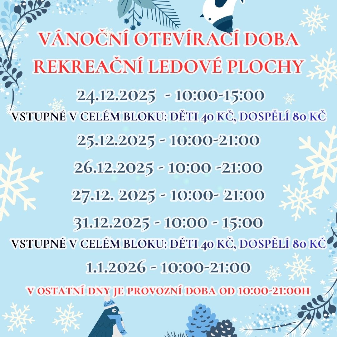 Ledová plocha – otevřeno téměř každý den, Štědrý den a Silvestr zkrácený provoz.