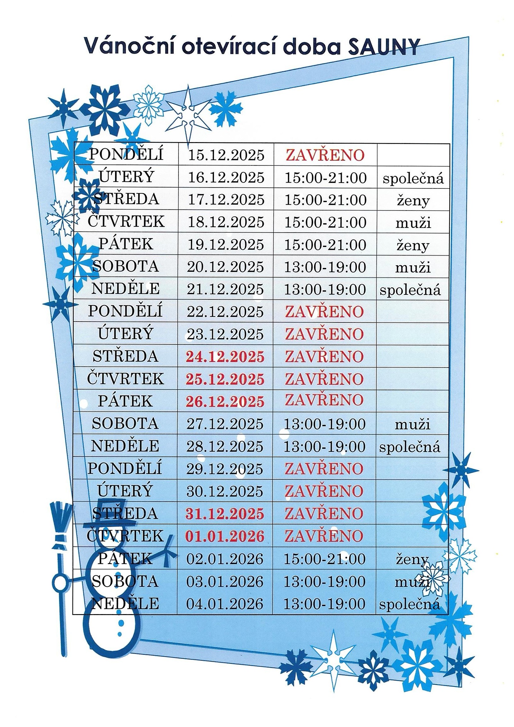 Sauna – přes Vánoce zavřeno, další dny dle rozpisu mužů/žen/společné.